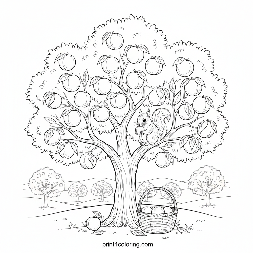 Explore a sunny peach orchard in this detailed scene! A mature peach tree overflows with ripe fruit, its branches gently bowing. A playful squirrel enjoys a tasty peach, and a wicker basket catches fallen treasures. Imagine the warm sun and rolling hills as you bring this delightful harvest scene to life with your colors.