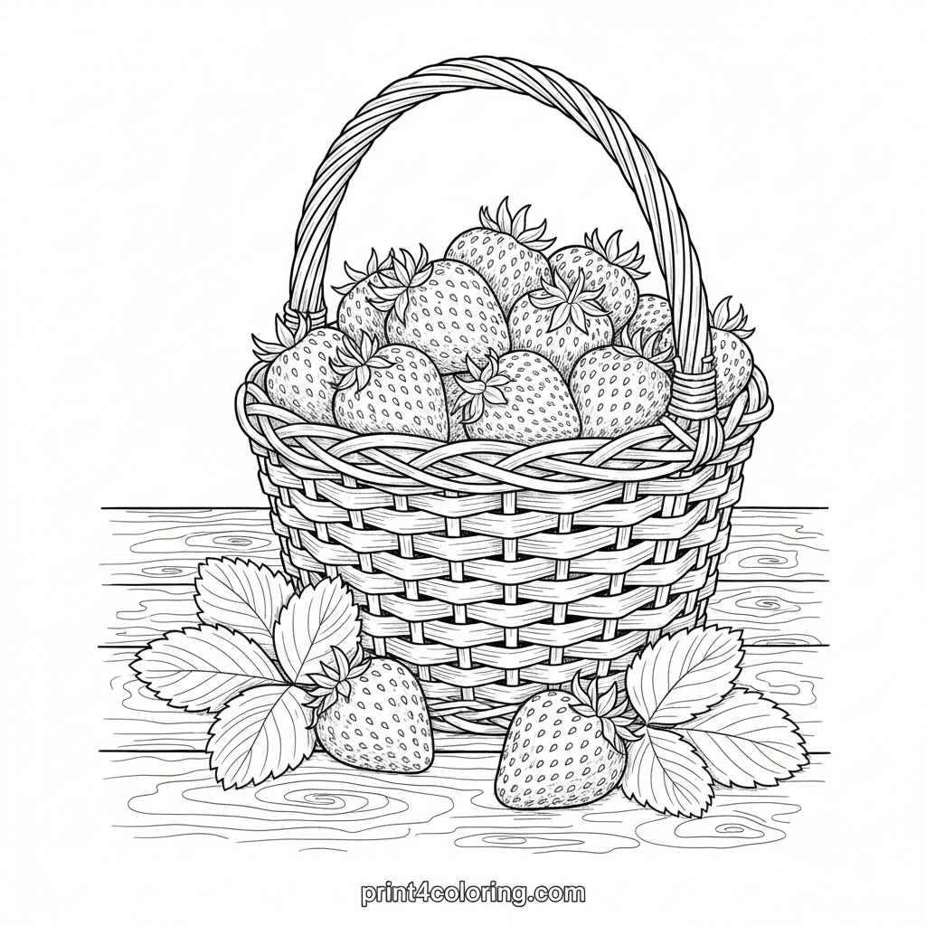Dive into the delicious world of freshly picked strawberries! This charming coloring page features a rustic wicker basket overflowing with plump, ripe berries, some still showing their green caps. A few loose strawberries and delicate leaves are scattered on a textured wooden surface, inviting you to add vibrant colors to this sweet harvest scene.