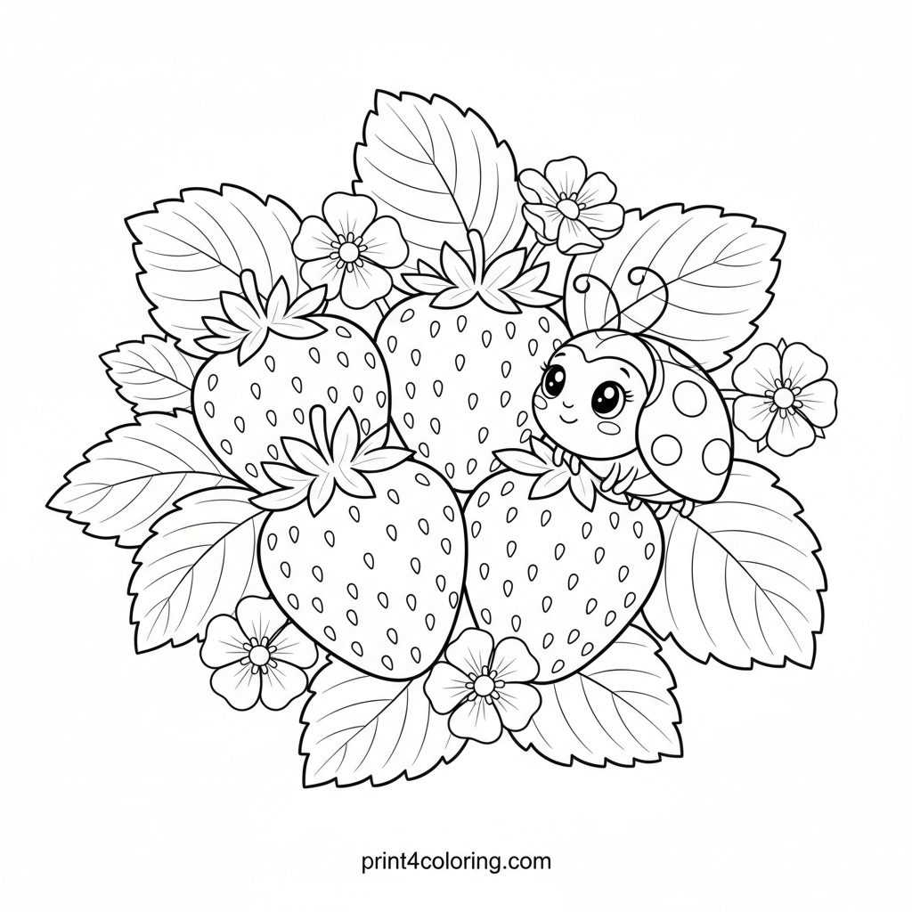 Dive into a delightful strawberry patch! This intricate coloring page features plump, juicy strawberries peeking out from lush green leaves and delicate white blossoms. A tiny, friendly ladybug has found a cozy spot on a leaf, adding a touch of charm to this sweet garden scene. Perfect for detail-oriented colorists!