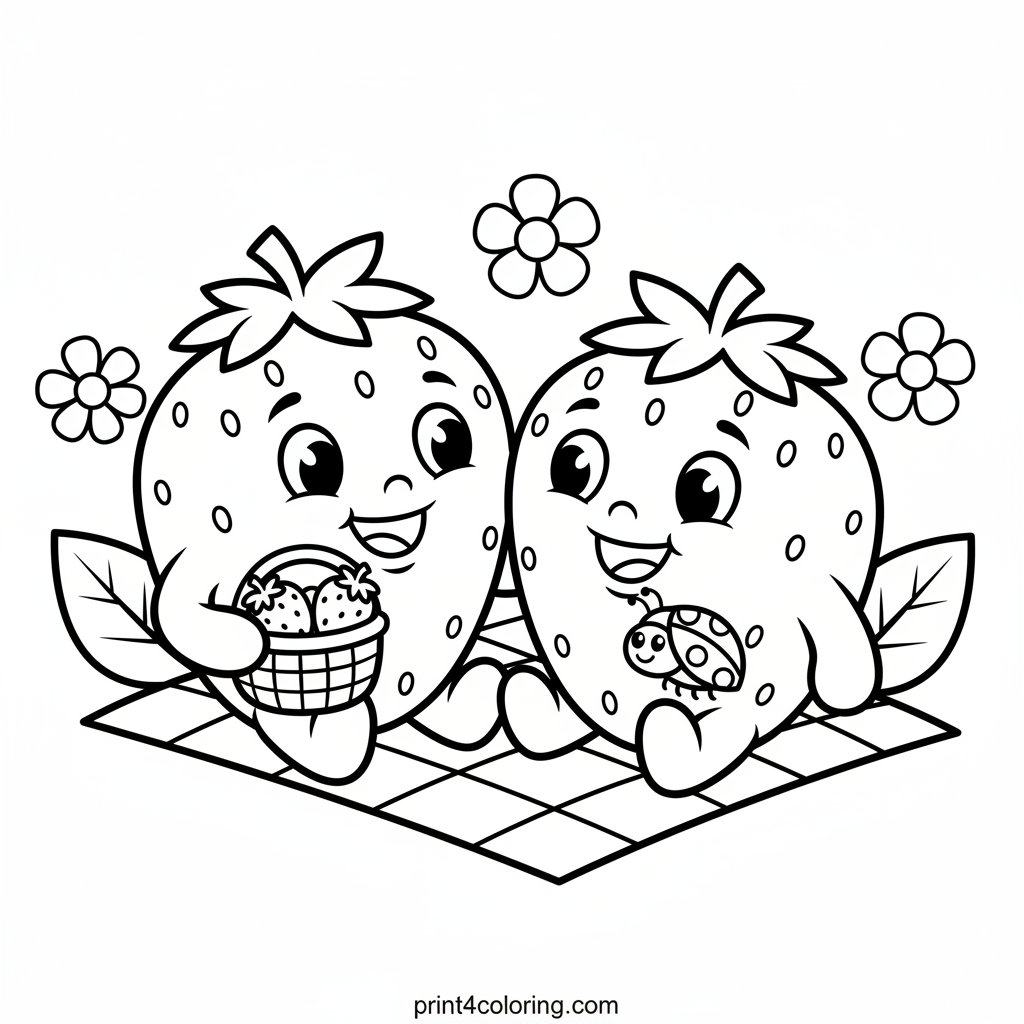 Join two happy strawberry friends on a delightful picnic! They're sharing a basket of berries and giggling with a friendly ladybug. With simple flowers and leaves in the background, this charming scene is perfect for little artists to bring to life with their favorite colors.