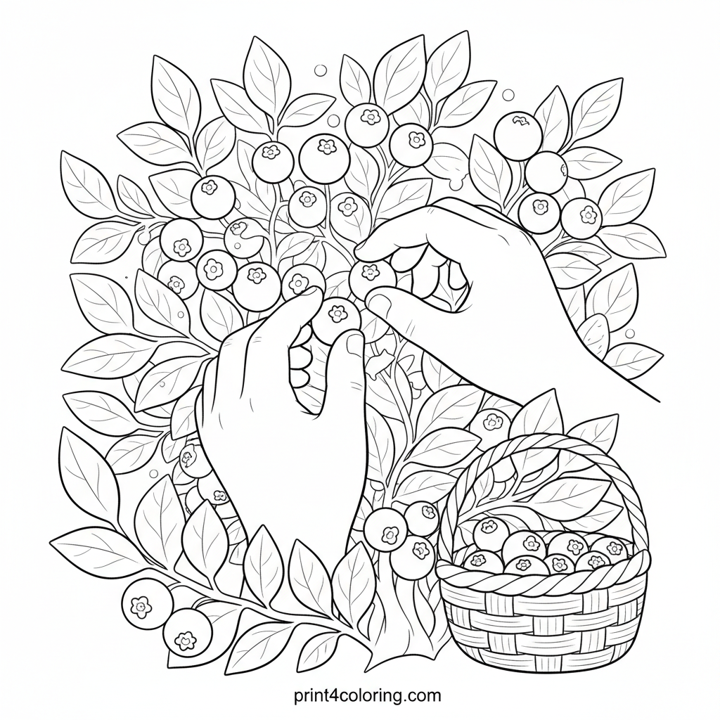 Imagine gentle hands carefully plucking juicy blueberries from a leafy bush. This cozy scene captures the simple joy of a summer harvest, with individual berries nestled among green leaves and a rustic basket waiting to be filled. A delightful page for mindful coloring.