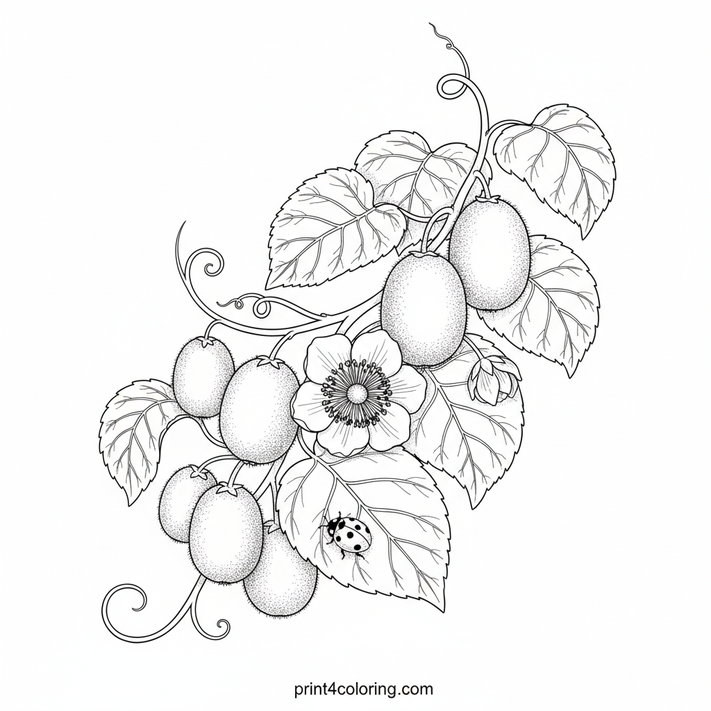 #kiwi#vine#fruit#life-cycle#botanical#nature#ladybug#plant#flower#coloring-page#printable