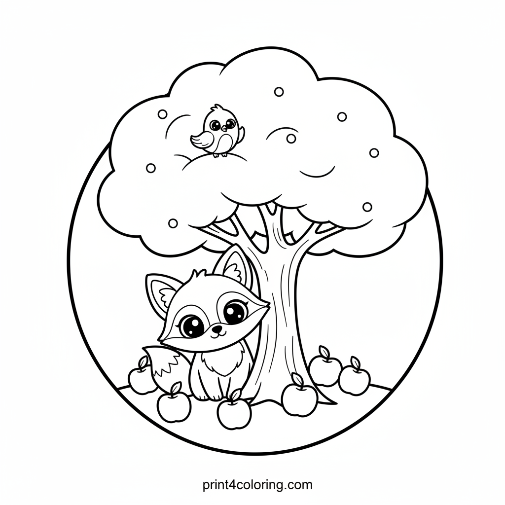 Discover a charming scene where a curious little fox, with big, round eyes, peeks playfully from behind a majestic apple tree. Fallen apples litter the ground, inviting a taste. Look closely, and you'll spot a tiny bird perched on a branch above, adding to this cozy woodland secret. A delightful picture for young colorists!