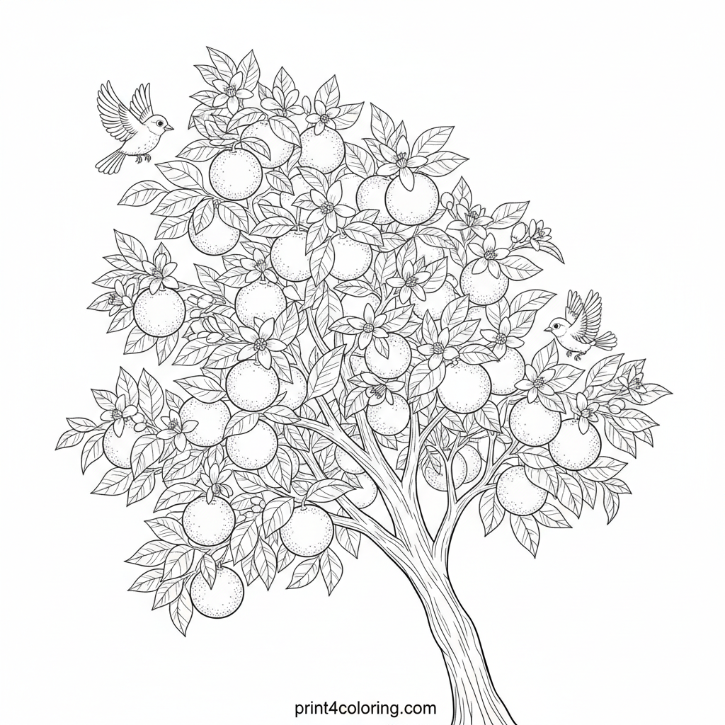 Immerse yourself in the detailed beauty of a vibrant orange tree, heavy with ripe, round oranges and glossy green leaves. Delicate white blossoms dot the branches, while a tiny, friendly bird perches, observing the scene. A wonderful challenge for expert colorists to bring to life!
