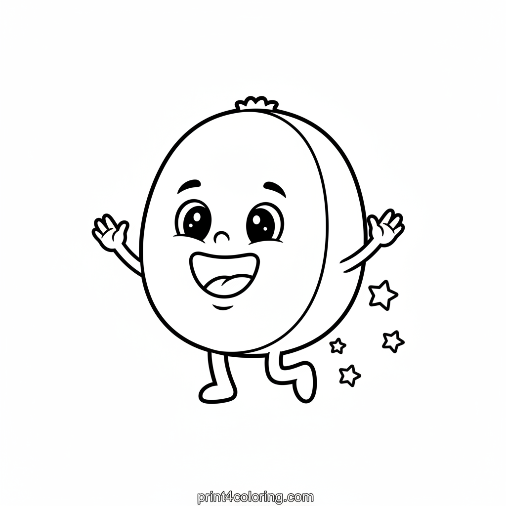 Join our cheerful kiwi fruit as it bounces with joy through a vibrant green field! With tiny arms and legs, this happy fruit giggles all the way, leaving a sparkling trail of little star shapes behind. Get ready to add bright colors to this delightful, close-up adventure!