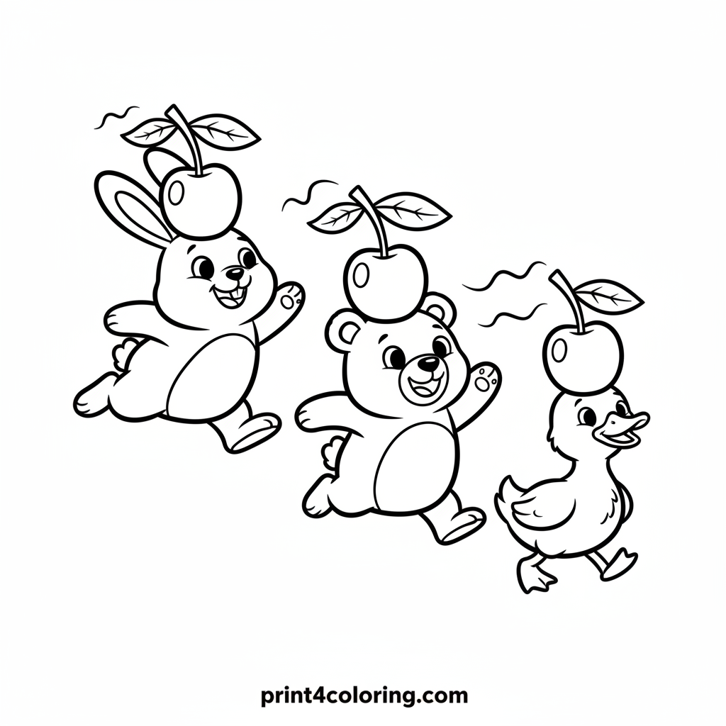 Join a delightful parade of adorable animals! A happy bunny, a smiling bear cub, and a cheerful duckling are all marching along, proudly wearing the silliest hats made from giant, juicy cherries. Imagine the fun as they step to the beat, ready for you to add a splash of color to their festive procession. Get ready to color this joyful scene!