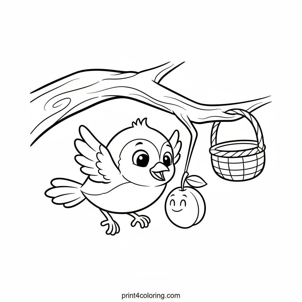 Meet our happy little bird, perched high in a plum tree! With bright eyes, this feathered friend is gently helping to gather ripe, round plums into a small basket. Imagine the sweet smell of the plums as you color this lovely harvest scene. A delightful picture for a sunny day!