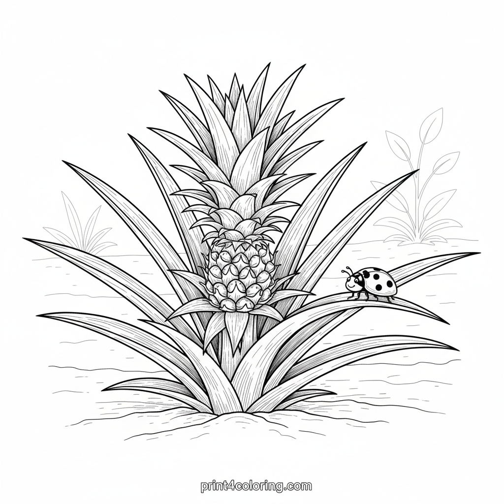 Discover the magic of a young pineapple sprout as it begins to grow its sweet fruit! This detailed scene features lush, spiky leaves and a tiny pineapple just forming. A friendly ladybug rests on a leaf, adding charm. Grab your crayons and bring this tropical garden to life with vibrant colors!