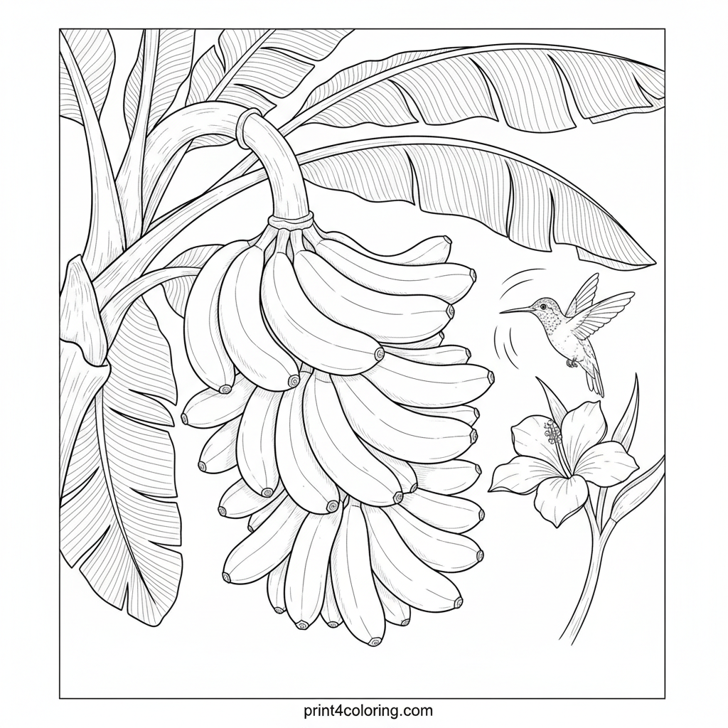 Tropical Banana Bounty: A Hummingbird's View Coloring Page
