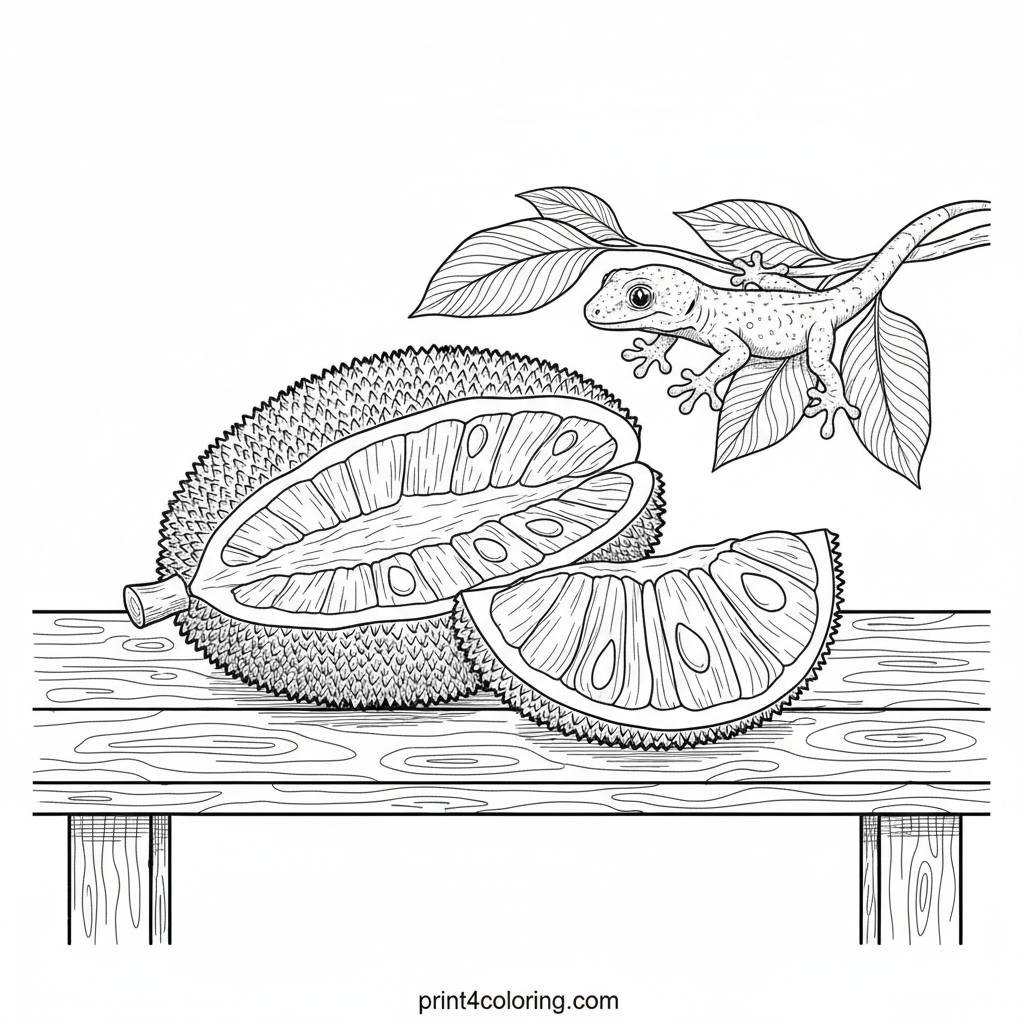 Dive into a delicious tropical scene! Color a magnificent, cut-open jackfruit resting on a rustic wooden table, revealing its fascinating textures. A tiny, friendly gecko peeks from behind a leafy branch, eyeing the sweet fruit. Explore intricate wood grains and the unique patterns of this exotic treat in this detailed coloring adventure.
