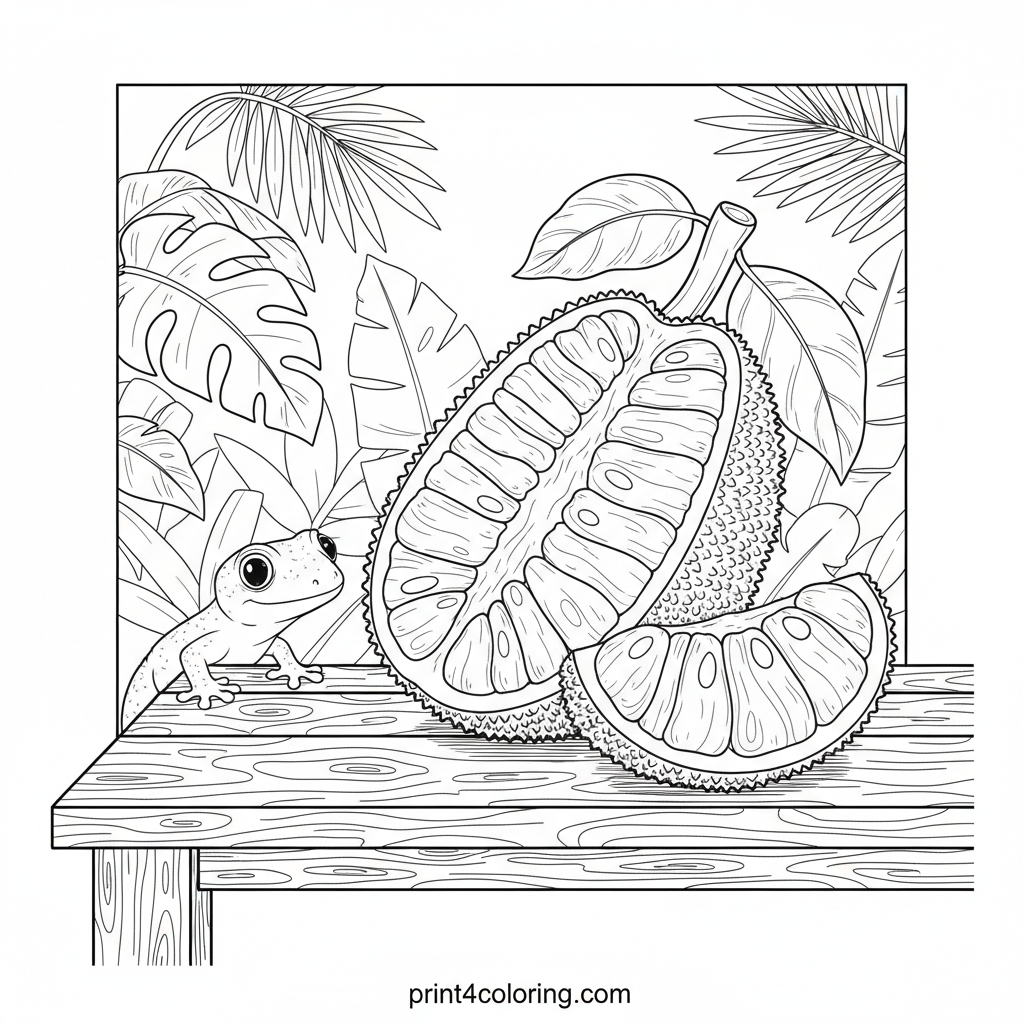 Tropical Jackfruit Still Life: A Gecko's Delight Coloring Page