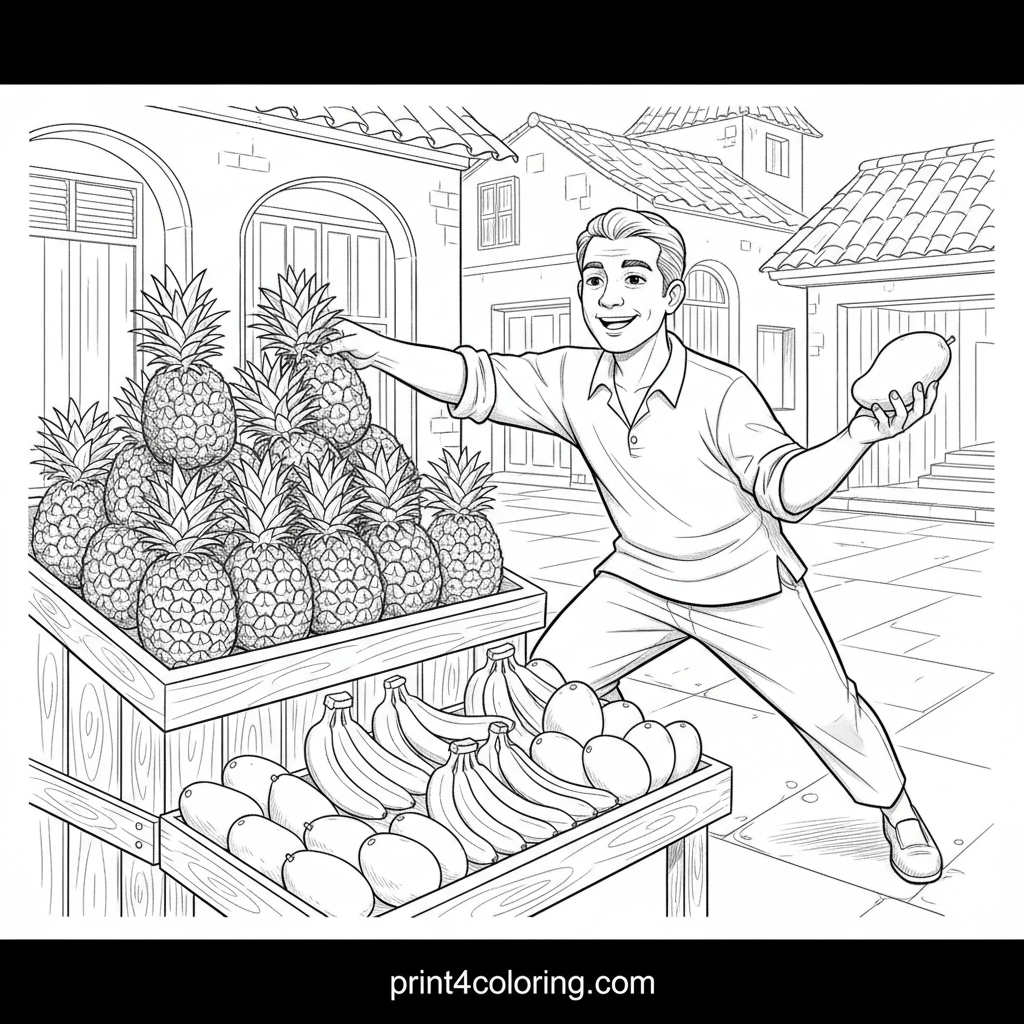 Step into a lively tropical market! This detailed scene showcases a vibrant pineapple stand brimming with juicy pineapples, ripe mangoes, and sweet bananas. Intricate traditional market buildings form the backdrop. Bring this bustling, delicious paradise to life with your expert coloring skills!