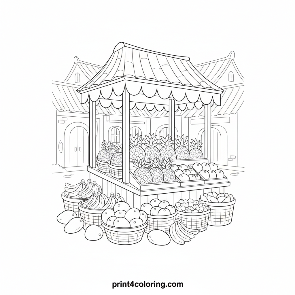 Step into a bustling tropical market scene! This detailed coloring page features a charming stand overflowing with juicy pineapples, ripe mangoes, and sweet bananas. Discover intricate market buildings in the background, inviting you to add vibrant colors to every corner of this lively, cozy illustration.