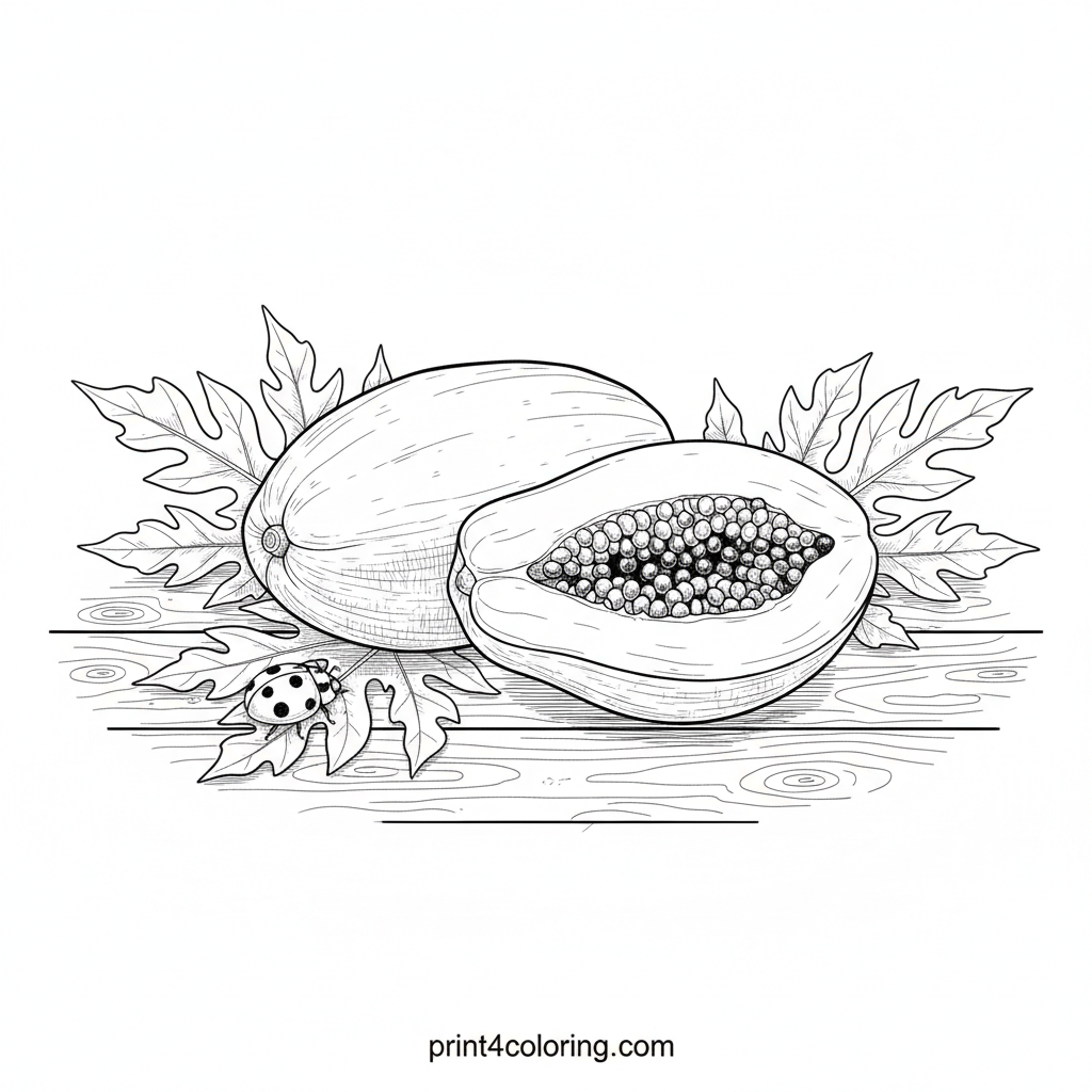 Explore a vibrant tropical scene featuring delicious papayas! Color a whole ripe papaya and a sliced one showing its fascinating seeds. They rest on a rustic wooden surface, surrounded by intricate leaves and a tiny, friendly ladybug peeking out. A delightful botanical adventure awaits!