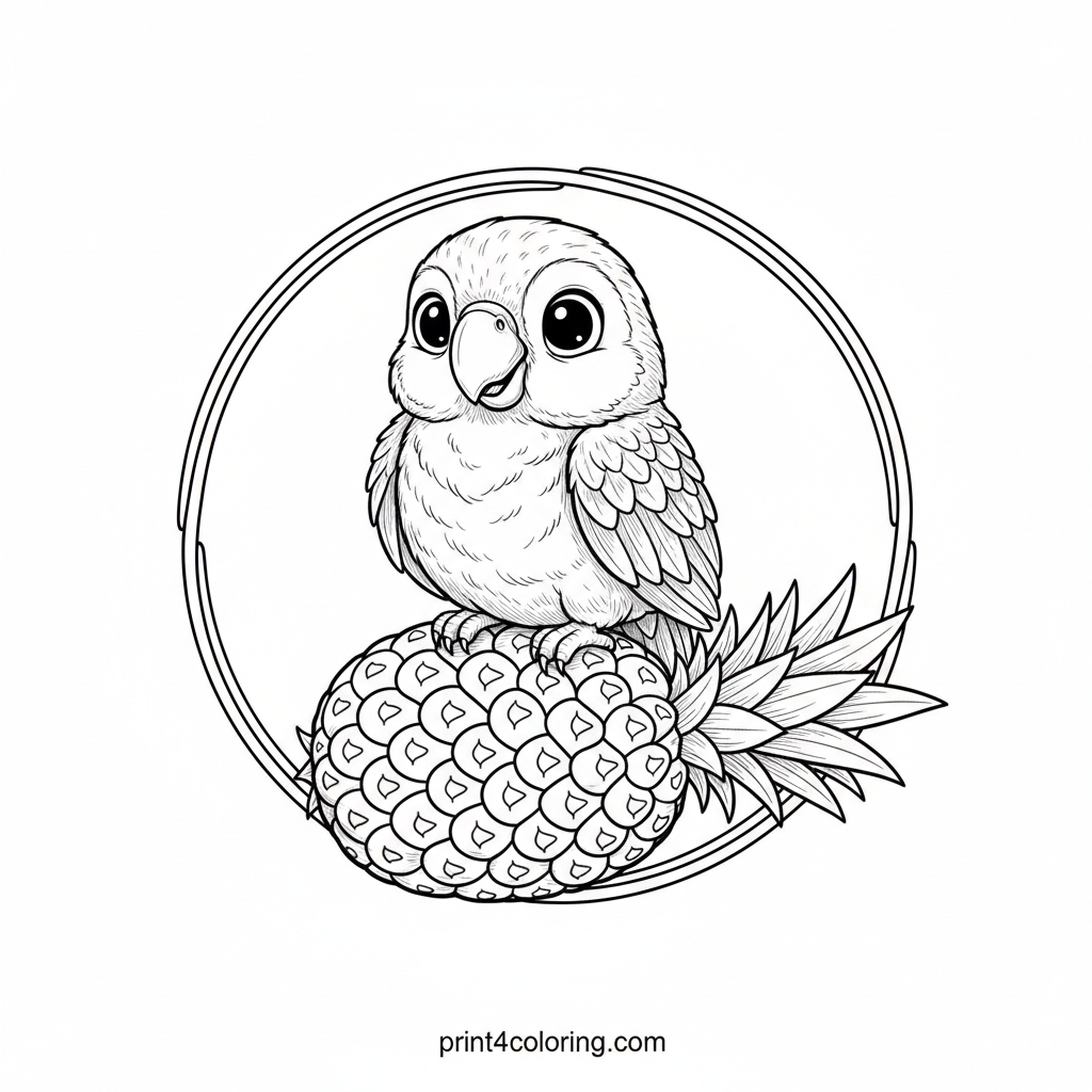 Dive into a vibrant scene where a magnificent parrot with intricate feathers rests gracefully on a ripe, textured pineapple. This detailed illustration invites you to bring the beauty of the tropics to life. Explore the spiky leaves and the bird's playful gaze in this expert-level coloring adventure perfect for nature lovers.