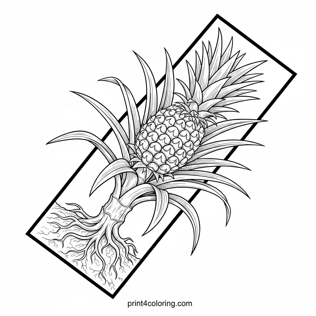 Dive into the lush world of a pineapple plant with this expert coloring page! Explore the amazing diamond pattern of the fruit, the sharp, sword-like leaves, and the strong stem. Discover the tiny roots nestled in rich tropical soil, bringing this exotic plant to life with your colors.