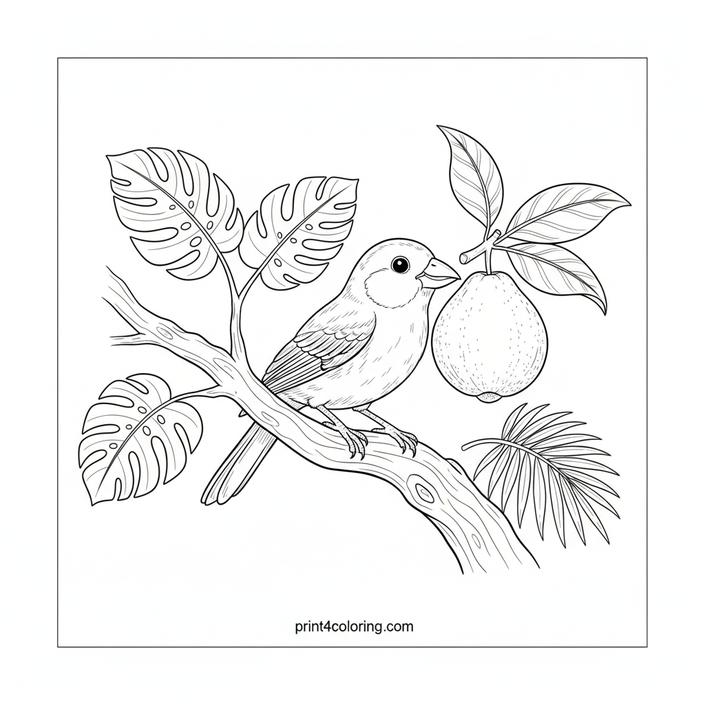 Vibrant Guava Snacktime: A Tropical Bird's Feast Coloring Page