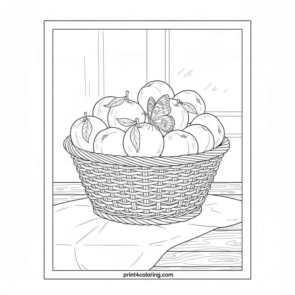 Explore a charming still life! A vintage basket brims with ripe nectarines and delicate leaves, resting on a rustic surface. Intricate textures await your colors. A magnificent butterfly with patterned wings is gently perched on a nectarine, adding natural beauty to this delightful summer scene.