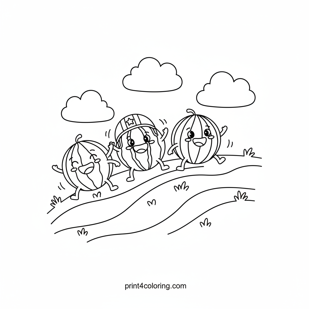 Join three happy watermelons as they tumble down a sunny, grassy hill in a friendly, giggle-filled race! Watch as one tiny watermelon, sporting a funny racing helmet, tries to roll the fastest. This delightful scene is bursting with summer fun and ready for your brightest colors.