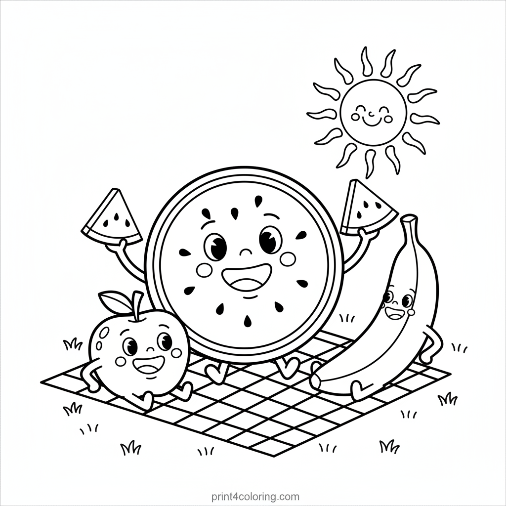 Join a big, friendly watermelon as it hosts the most delightful picnic in the park! See the giggling apple and cheerful banana enjoying sweet slices on a sunny day. This heartwarming scene of fruit friends sharing and having fun is just waiting for your vibrant colors to bring it to life!