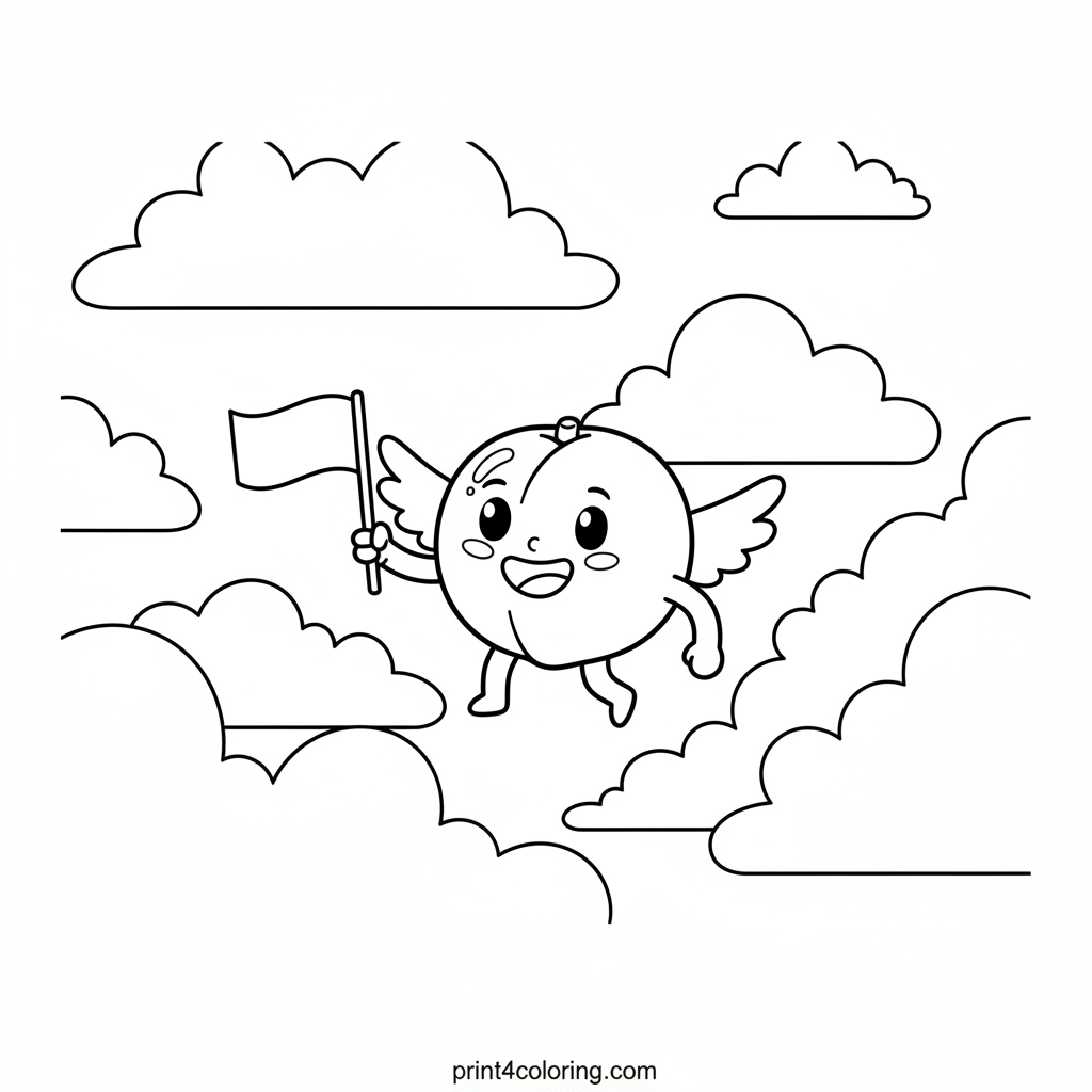Join a happy little nectarine with tiny wings as it soars through a bright, puffy cloud-filled sky! Watch as it waves a cheerful flag, exploring the vast blue yonder. This delightful scene invites you to add vibrant colors to its joyful journey, making the sky and clouds burst with fun.