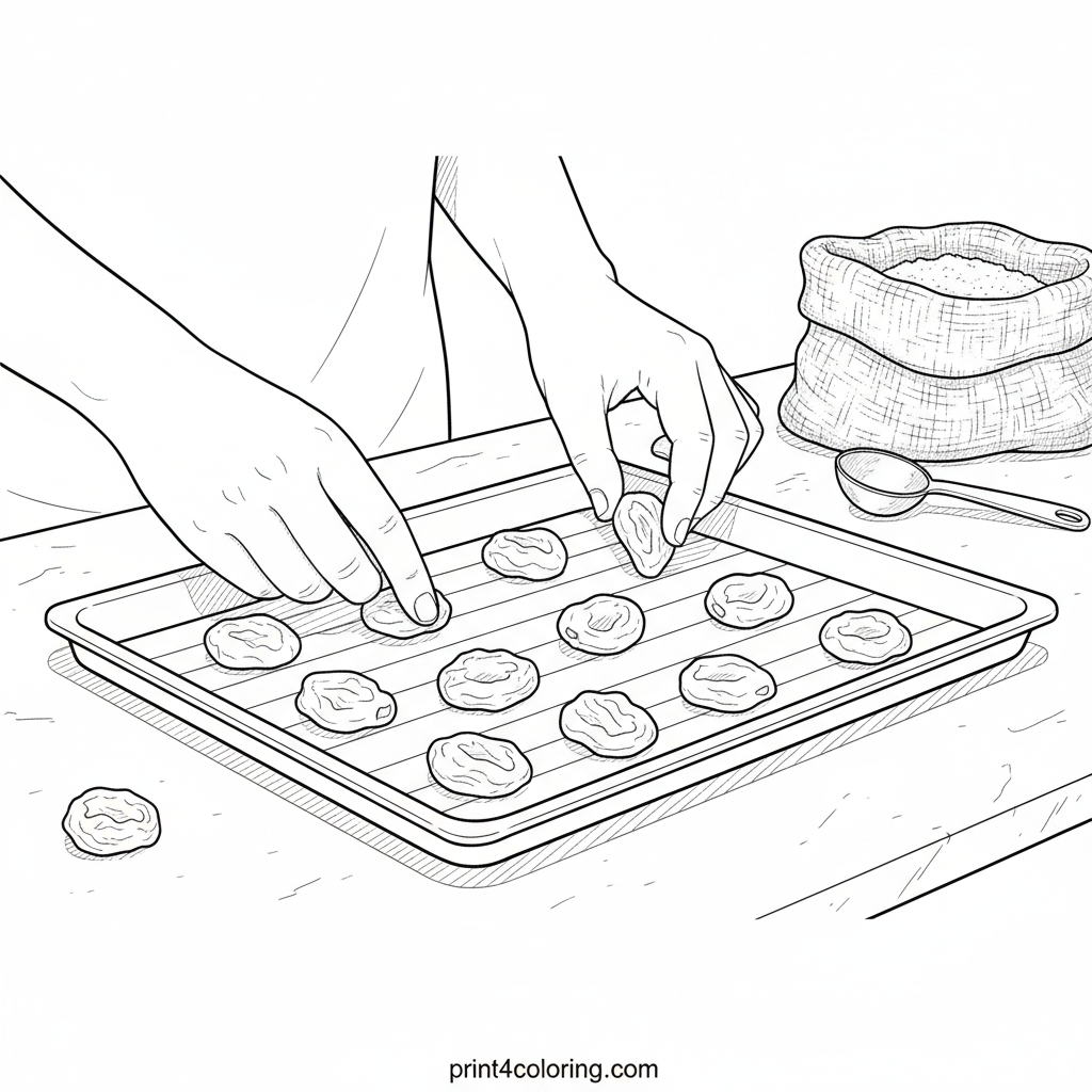 Step into a cozy kitchen scene where gentle hands meticulously arrange textured prunes onto a classic ridged baking sheet. Notice the rustic flour sack and a shiny measuring spoon in the background, hinting at delicious baking to come. This detailed page invites you to bring warmth and flavor to a wholesome baking moment.