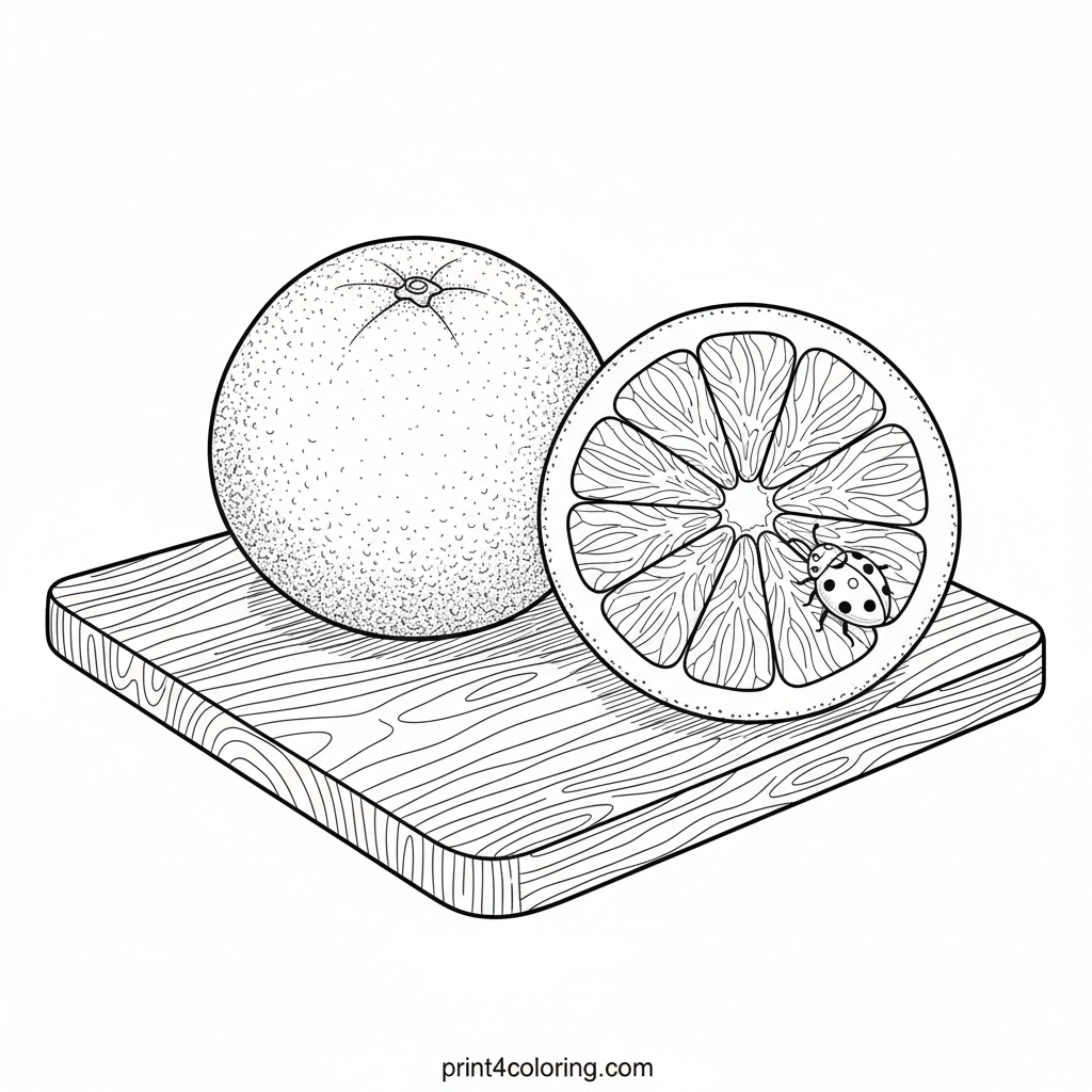 Dive into a detailed citrus scene featuring a whole grapefruit and its juicy half, resting on a rustic wooden board. A tiny, friendly ladybug peeks from an exposed segment, inviting you to add vibrant colors and realistic textures to this delightful still life. Perfect for aspiring artists!