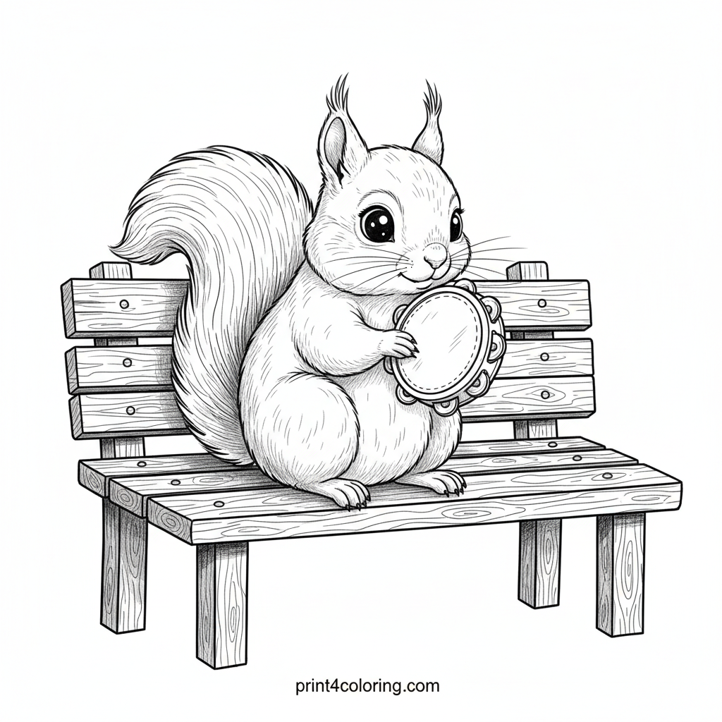 Discover a charming scene where a fluffy, big-eyed squirrel finds a tambourine on a rustic park bench. This highly detailed illustration invites you to color realistic textures like the squirrel's fur, the bench's wood grain, and the tambourine's shiny jingles. A cozy and engaging adventure awaits!