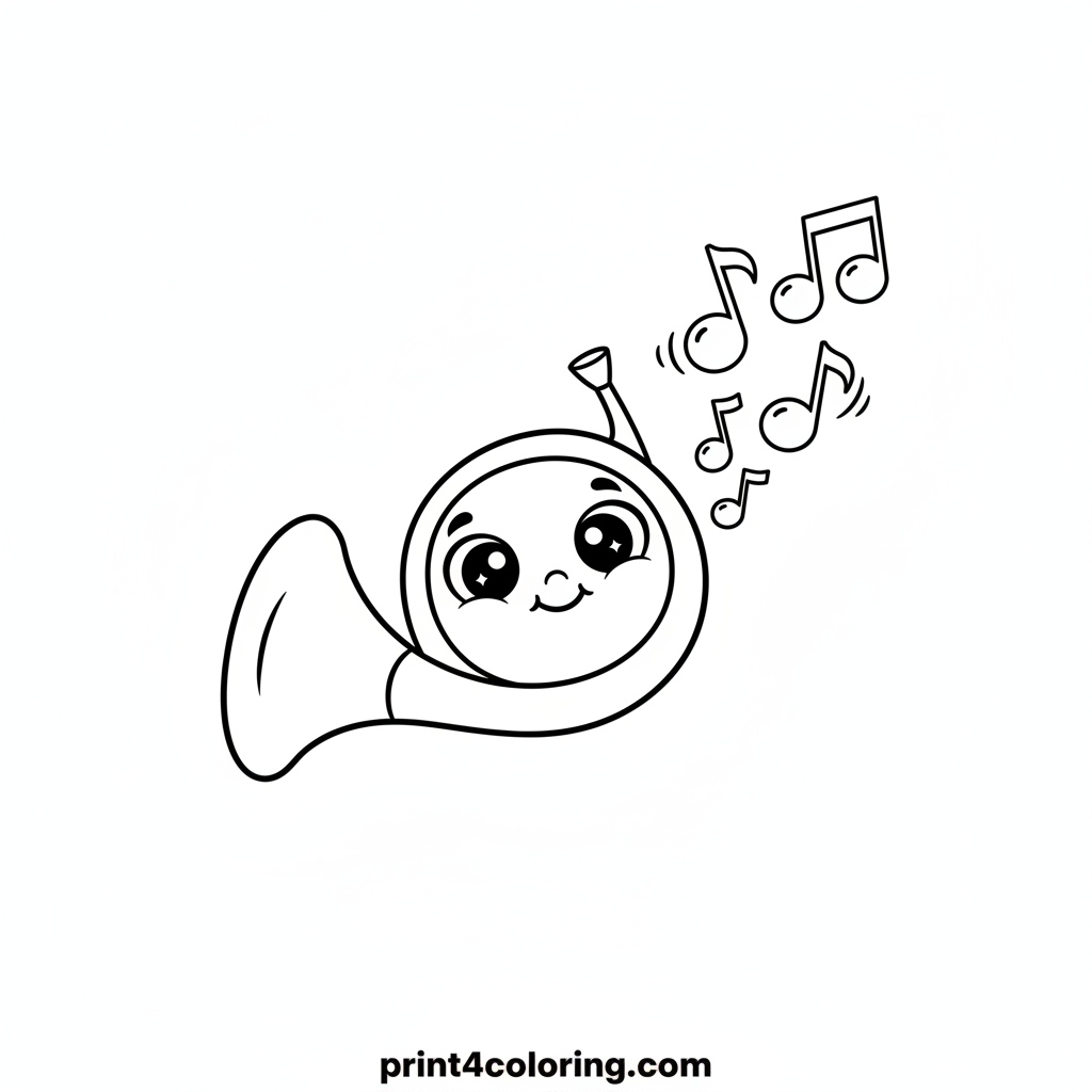 Meet our cheerful French Horn, ready to make some music! With big, friendly eyes and a wide smile, this silly instrument is 'tooting' out happy, round musical notes that float like colorful bubbles. Grab your crayons and bring this cozy, musical scene to life with your favorite bright colors. What a fun sound!
