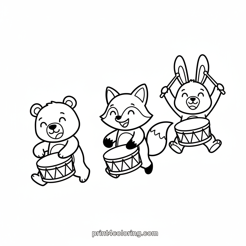 Get ready to tap your feet with this adorable animal bongo band! A friendly bear, a clever fox, and a speedy rabbit are all drumming with big smiles, making joyful music together. Imagine the fun colors you can use to bring their lively performance to life. It's a paw-some party waiting for your artistic touch!