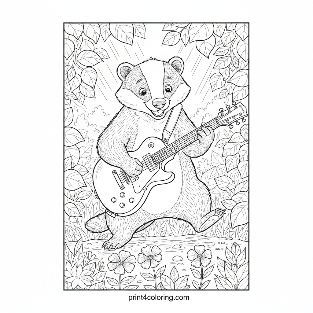 Get ready to color a rock star! A friendly, slightly oversized badger expertly strums an electric guitar in a sun-drenched backyard. Sunlight filters through lush leaves and delicate flowers. Capture the badger's focused, joyful expression as it creates an epic backyard jam session, full of natural detail.