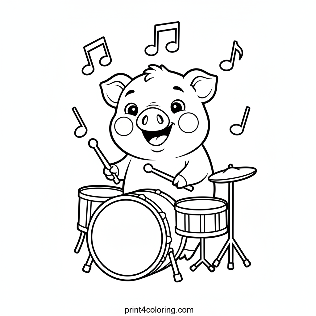 Get ready to tap your toes with this super cute piglet! Our happy little friend, with rosy cheeks and a big smile, is making music on a simple drum set. See the friendly musical notes floating all around? Grab your crayons and bring this joyful barnyard band to life!