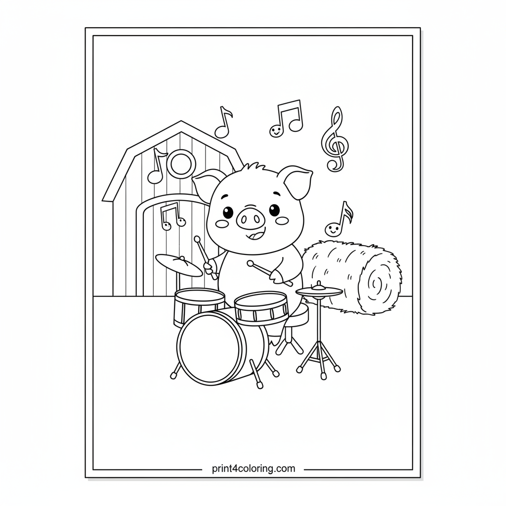 Get ready for farm-fresh rhythm! This delightful coloring page features a cheerful, plump piglet with rosy cheeks, happily playing a simple drum set. Musical notes dance around, inviting you to add vibrant colors to this adorable barnyard concert. Itβs a perfect scene for little artists to bring to life with their favorite crayons!