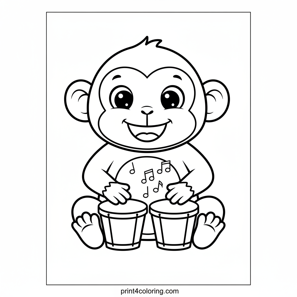 Meet a super cute, smiling monkey with big, friendly eyes, happily tapping on bongo drums! This joyful primate sits cross-legged, creating a cheerful beat. Little musical notes float up from the drums, ready for you to add vibrant colors and bring this groovy scene to life.