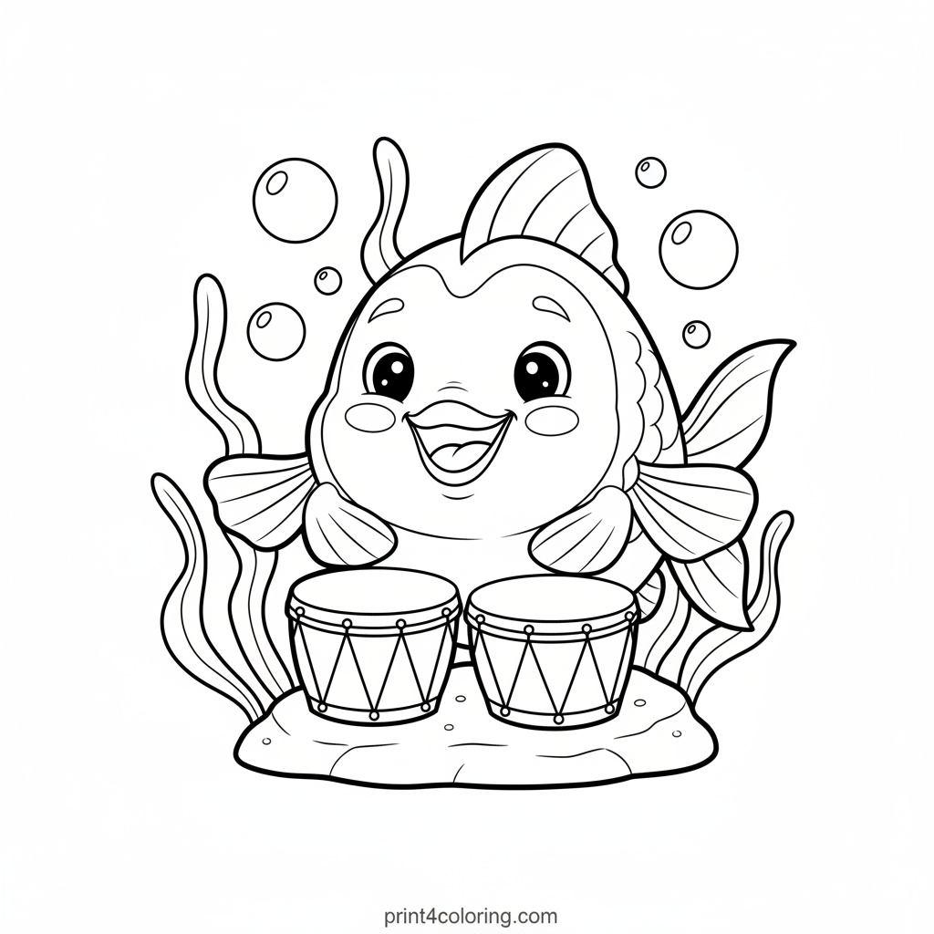 Dive into a world of underwater rhythm! Our friendly fish is having a blast, gently tapping on bongo drums made from shimmering seashells. Surrounded by cheerful green seaweed and tiny floating bubbles, this scene is bursting with musical fun. Get ready to add vibrant colors to this fin-tastic concert!