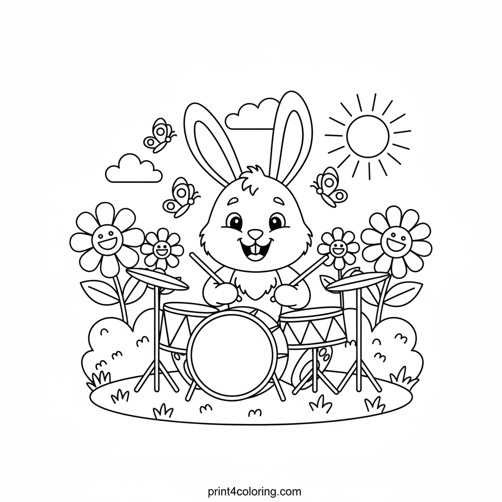 Hop into fun with this adorable bunny! Our fluffy friend is rocking out on a colorful drum kit in a sunny backyard, surrounded by beautiful flowers and dancing butterflies. Grab your crayons and add vibrant colors to this cheerful musical scene, bringing the backyard beat to life with every stroke.