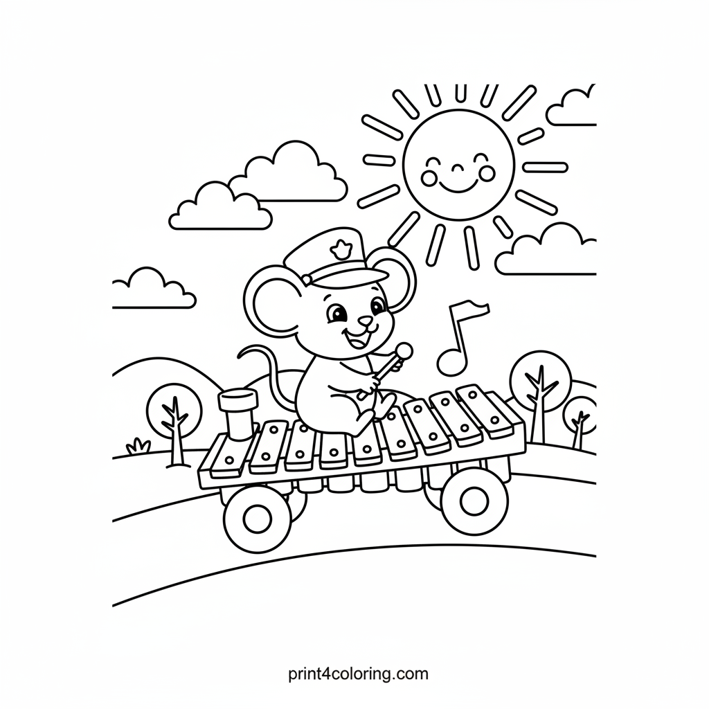All aboard the sound express! Meet our cheerful little mouse conductor, wearing a tiny hat and riding a magical xylophone train. Watch as this musical maestro taps out sweet melodies on the colorful bars, making music as he rolls along. Imagine the joyful tunes filling the air as you bring this delightful scene to life with your colors!