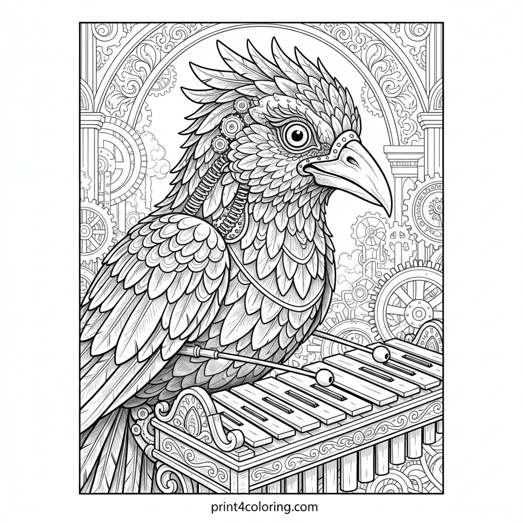 Dive into a world of intricate gears and melodies! This expert coloring page features a magnificent steampunk mechanical bird, complete with visible clockwork and metallic feathers, poised to play an antique xylophone. The detailed background showcases ornate industrial architecture. A challenging and rewarding scene for creative colorists!