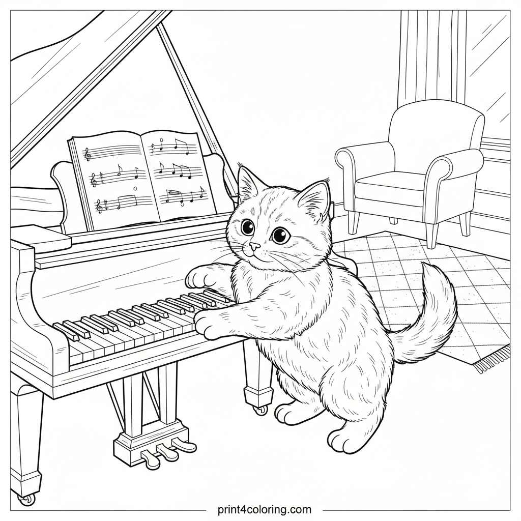 Welcome to a cozy, sunlit room where a fluffy kitten is making music! This detailed scene features an elegant grand piano with sheet music, intricate rug patterns, and charming furniture. Our curious kitten, with wide, playful eyes, is batting at the keys, ready for an adventure. Perfect for expert colorists!