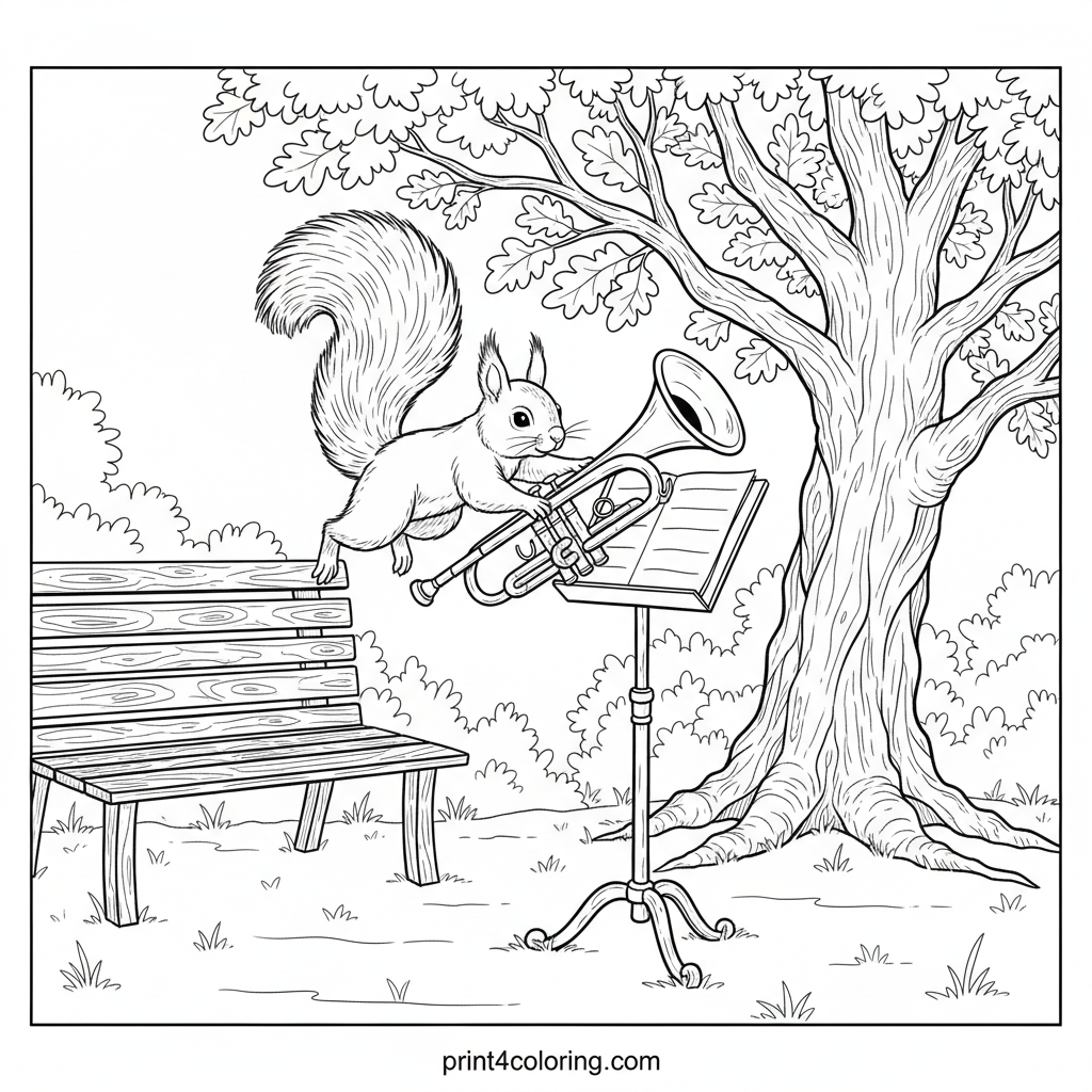 Dive into a delightful scene where a highly detailed, curious squirrel with a magnificent bushy tail investigates a shiny brass trumpet. Perched on a music stand in a serene park setting, surrounded by intricate leaves and branches, this expert-level page invites you to bring its musical adventure to life with vibrant colors and careful shading.