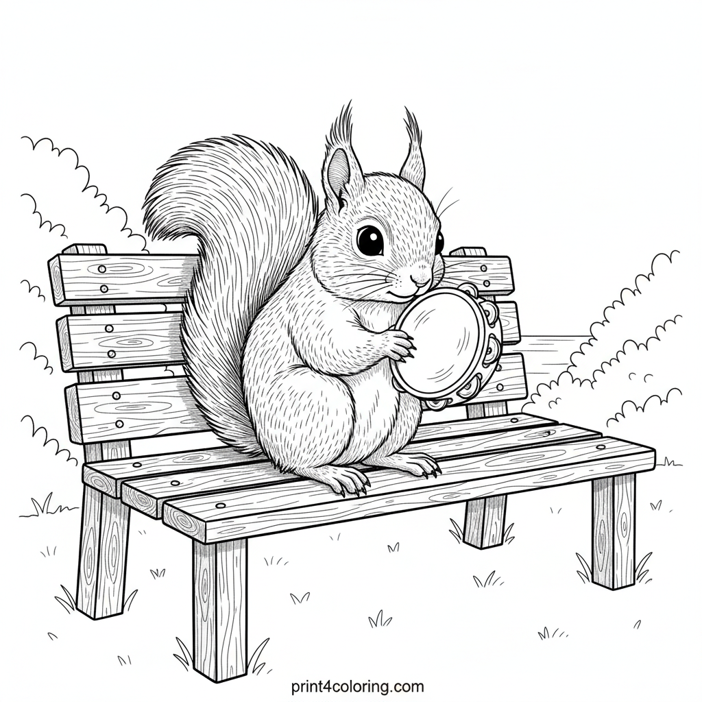 #squirrel#tambourine#park bench#nature#musical instrument#woodland#coloring-page#printable