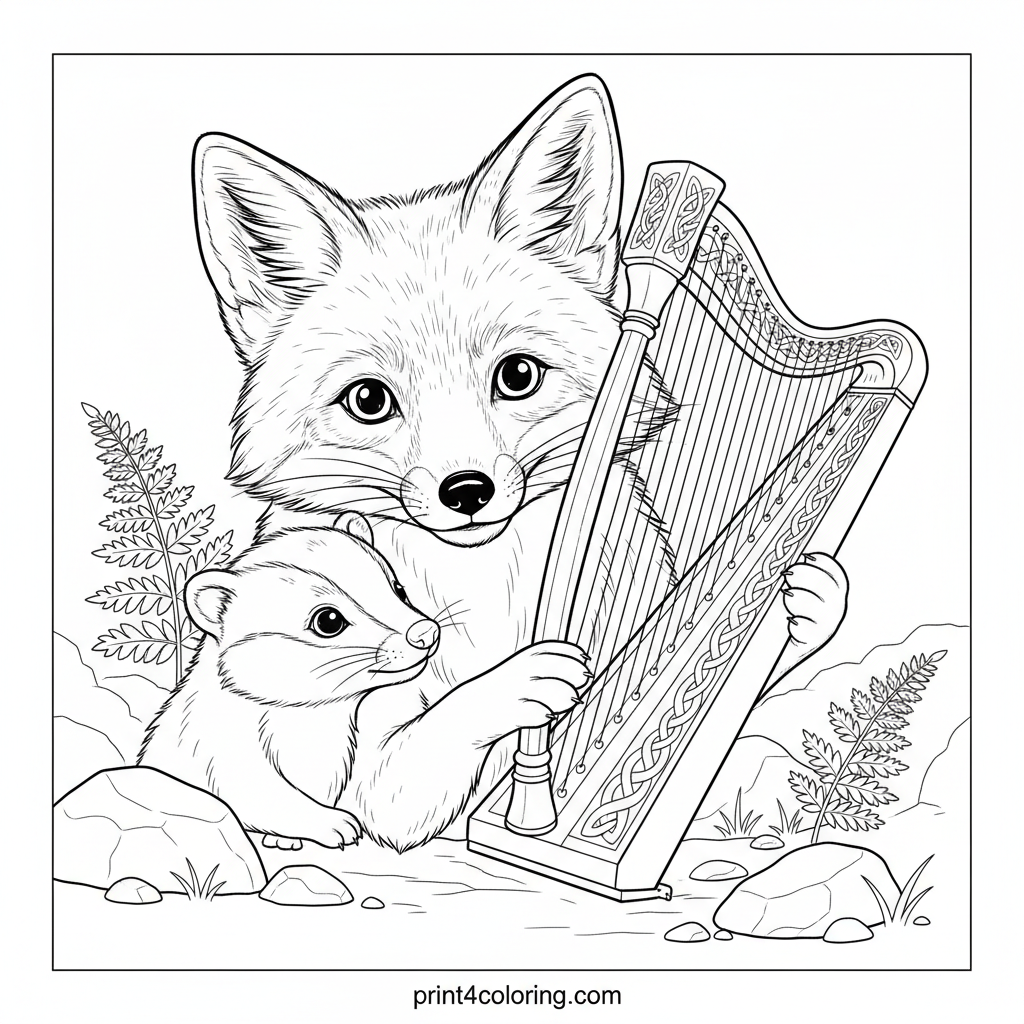 A curious red fox gently nudges a Celtic harp, creating a soft tune in an enchanted forest. An adorable badger cub listens intently amidst detailed ferns and mossy rocks. Bring this tranquil woodland serenade to life with your most vibrant colors!