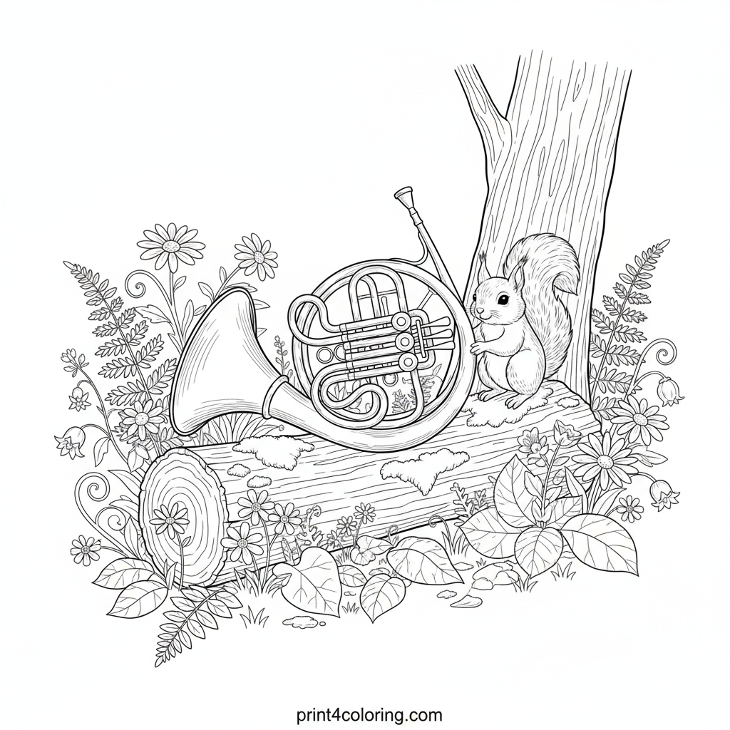 Imagine a secret forest clearing where a gleaming french horn rests on a soft mossy log. Delicate wildflowers and lush ferns surround it, while a curious squirrel peeks from behind a tree, wondering about the beautiful instrument. Bring this serene scene to life with your colors!