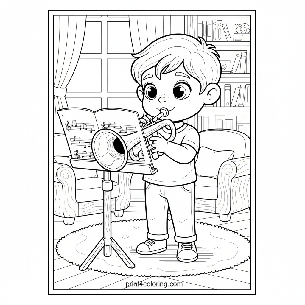 First Trumpet Lesson: A Young Musician's Cozy Start Coloring Page