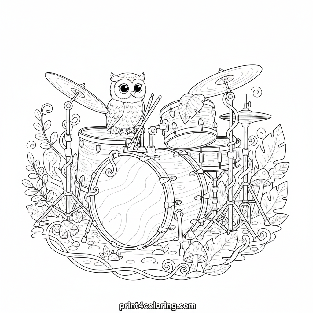 Forest Drum Serenade: Owl's Musical Retreat Coloring Page