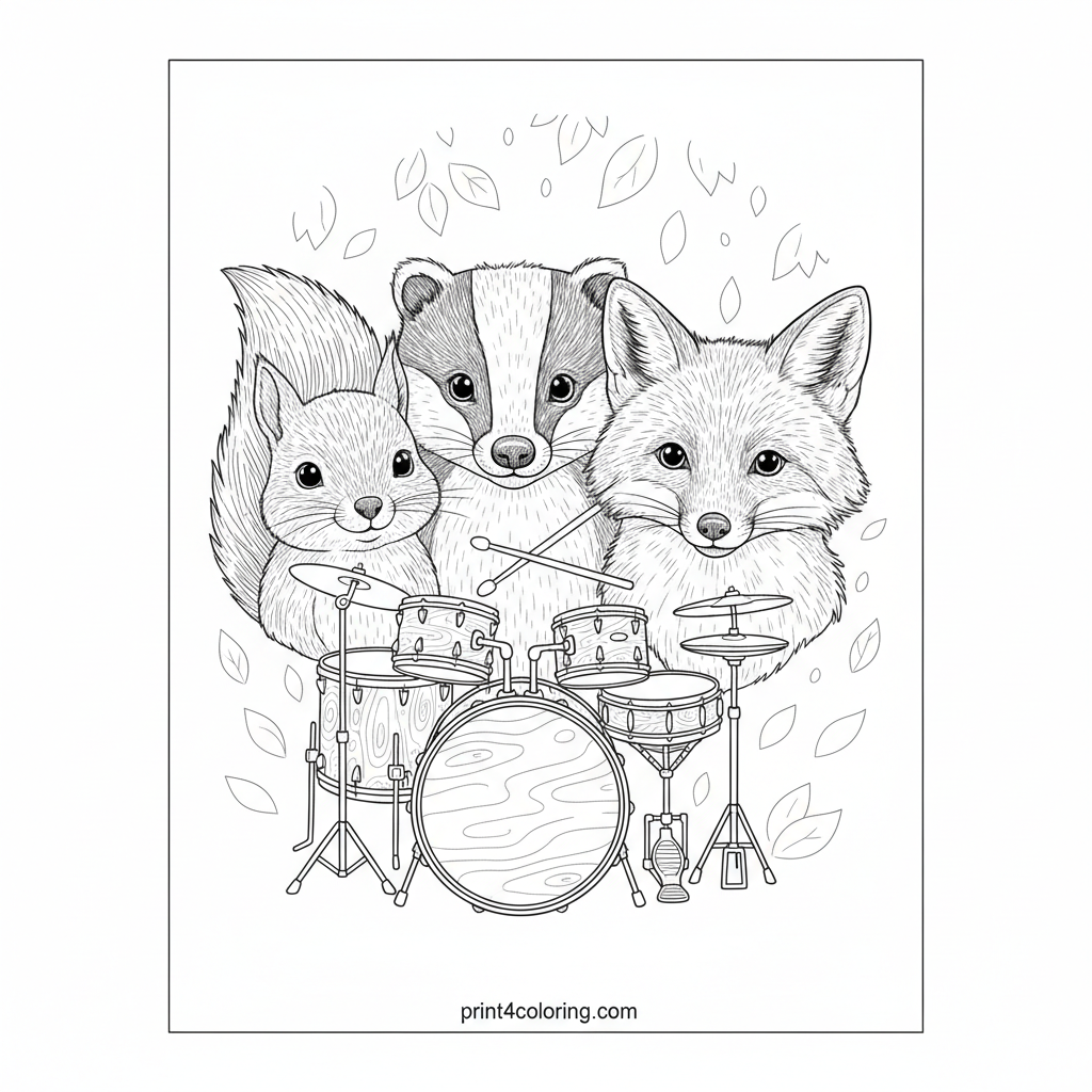 Join a curious squirrel, friendly badger, and watchful fox as they create harmonious rhythms in a sun-dappled forest clearing. This detailed close-up features intricate drums and soft animal expressions, perfect for an expert colorist seeking a challenging and rewarding scene.