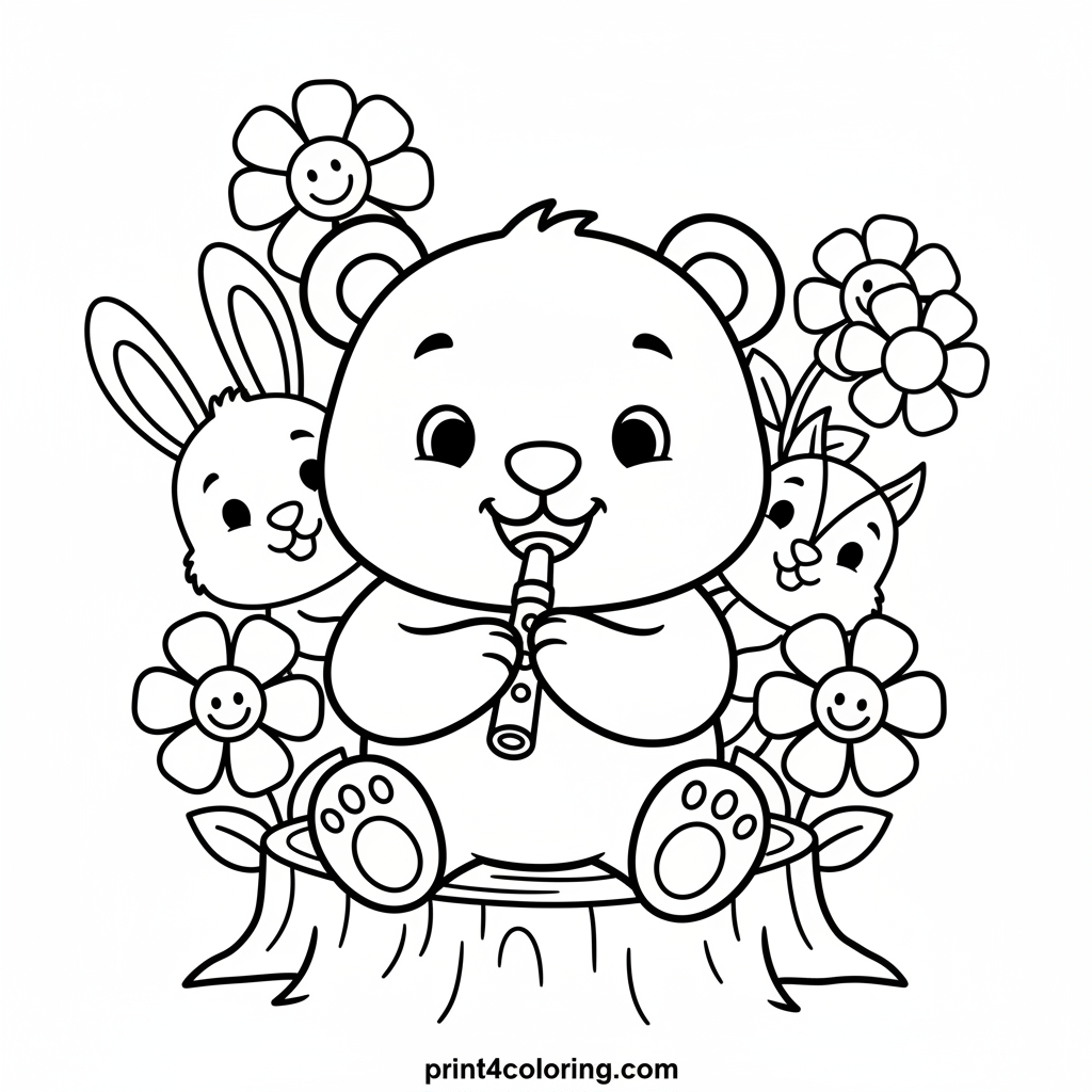 A happy bear cub plays a sweet flute tune on a tree stump, enchanting its forest friends. A friendly bunny and a cute squirrel listen with big smiles, surrounded by simple, cheerful flowers. This adorable scene celebrates music and friendship, perfect for young artists to color and bring to life!