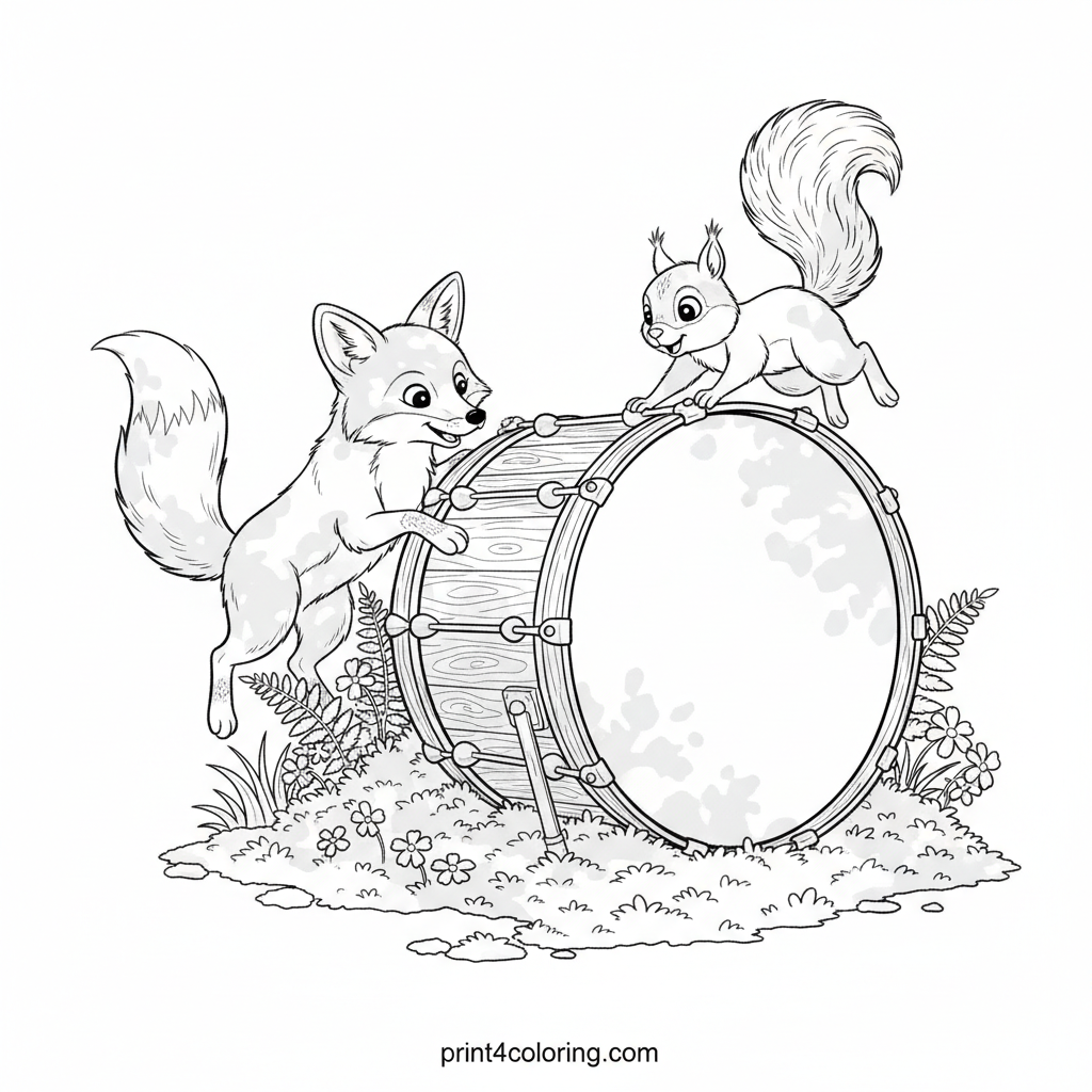 Join a clever fox and a curious squirrel as they uncover a mysterious bass drum deep in an enchanted forest. Sunlight dapples through the leaves, illuminating the mossy ground, ferns, and wildflowers. This detailed scene invites you to bring its magic to life with your colors and imagine the sounds they might make!