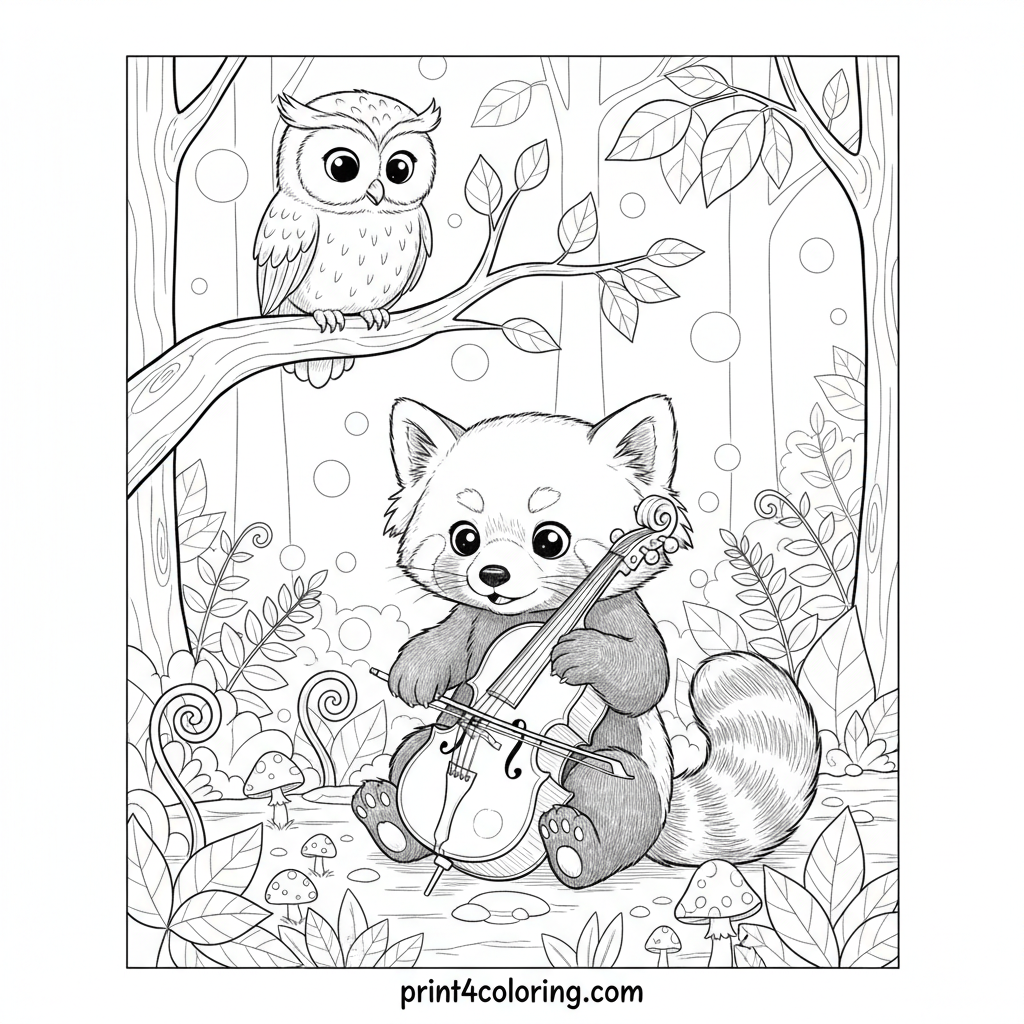 Join a fluffy red panda cub, big eyes wide with wonder, as it learns to play the cello in a sun-dappled forest. Surrounded by intricate leaves, ferns, and tiny mushrooms, a wise owl offers gentle encouragement. A delightful scene perfect for detailed coloring.