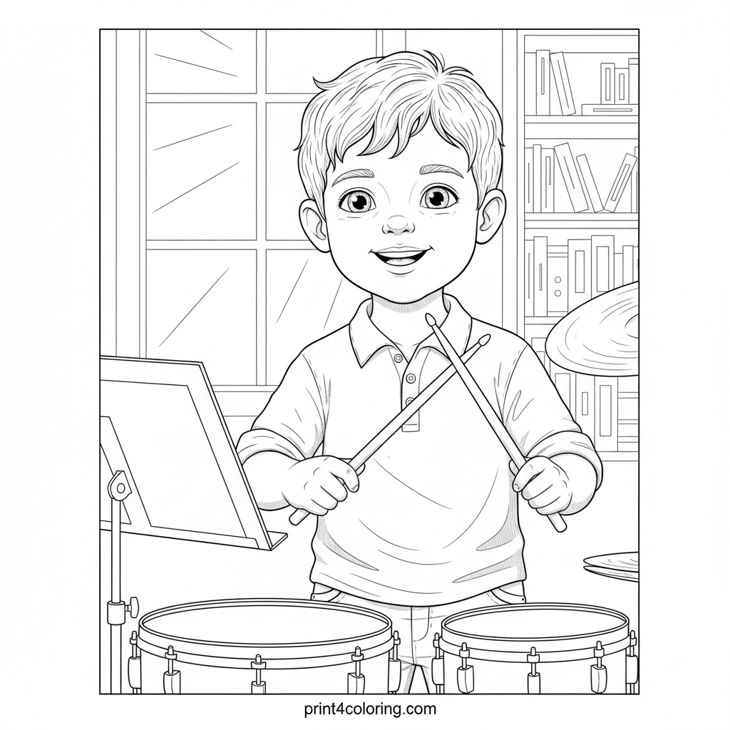 Get ready to color a future music star! This expert page features a young drummer, about 8-10, poised at a detailed classic drum kit, sticks in hand. Sheet music awaits, and subtle room elements like a window add to the cozy practice vibe. A rhythmic adventure!